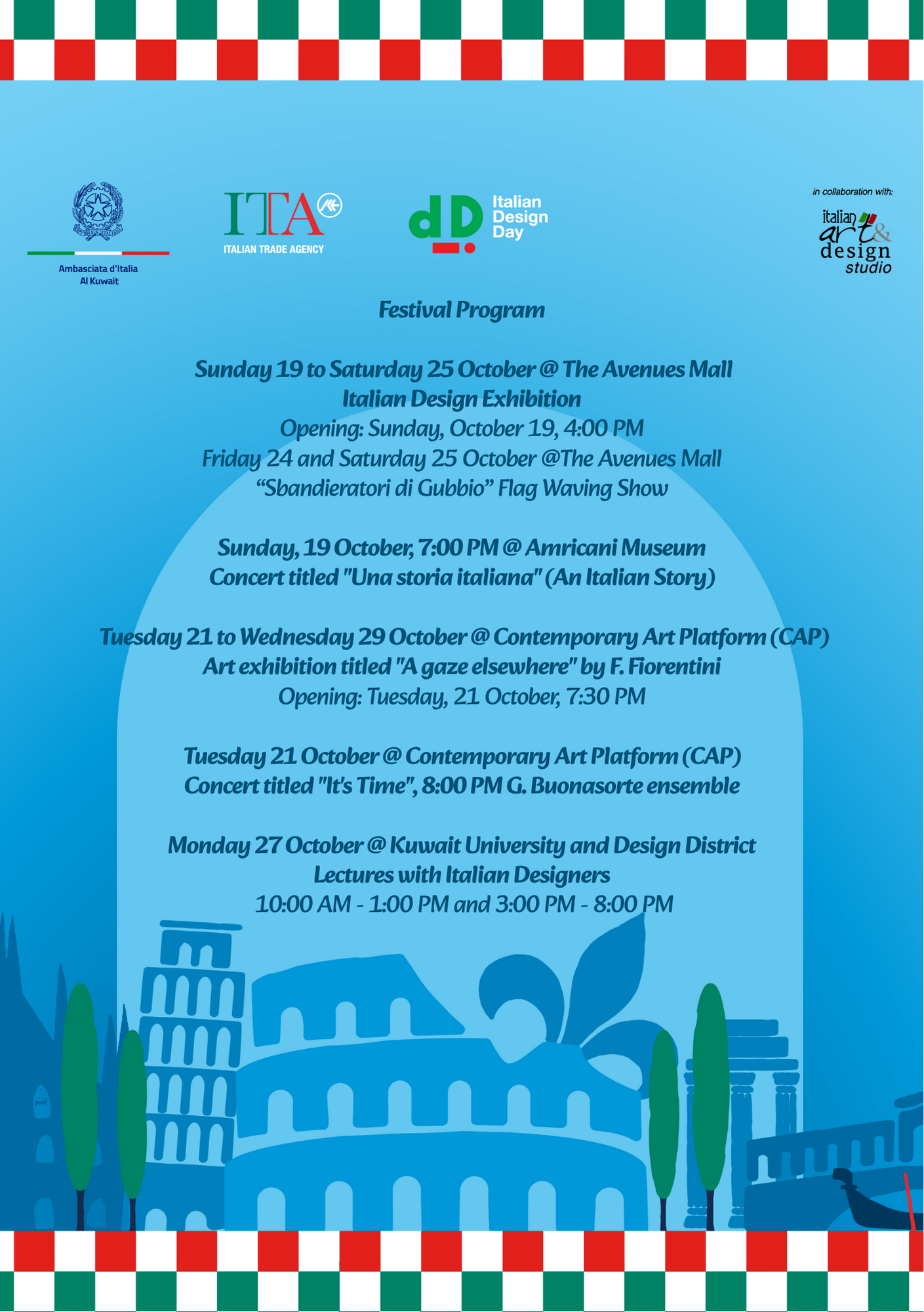 The program will also include musical concerts at the Amricani Museum and the Contemporary Art Platform (CAP), organized in collaboration with the Ahmadi Group Orchestra, featuring joint performances by Italian and Kuwaiti artists. In addition, audiences at The Avenues will be able to enjoy the spectacular performances of the Sbandieratori di Gubbio, who will bring to Kuwait the charm and tradition of historic Italian flag-waving displays — a symbol of Italy’s vibrant cultural heritage.